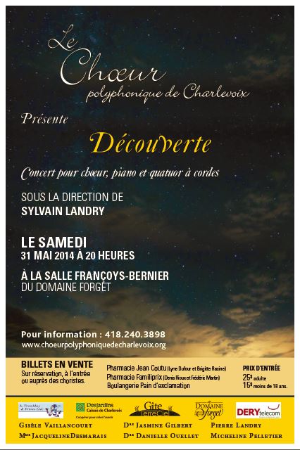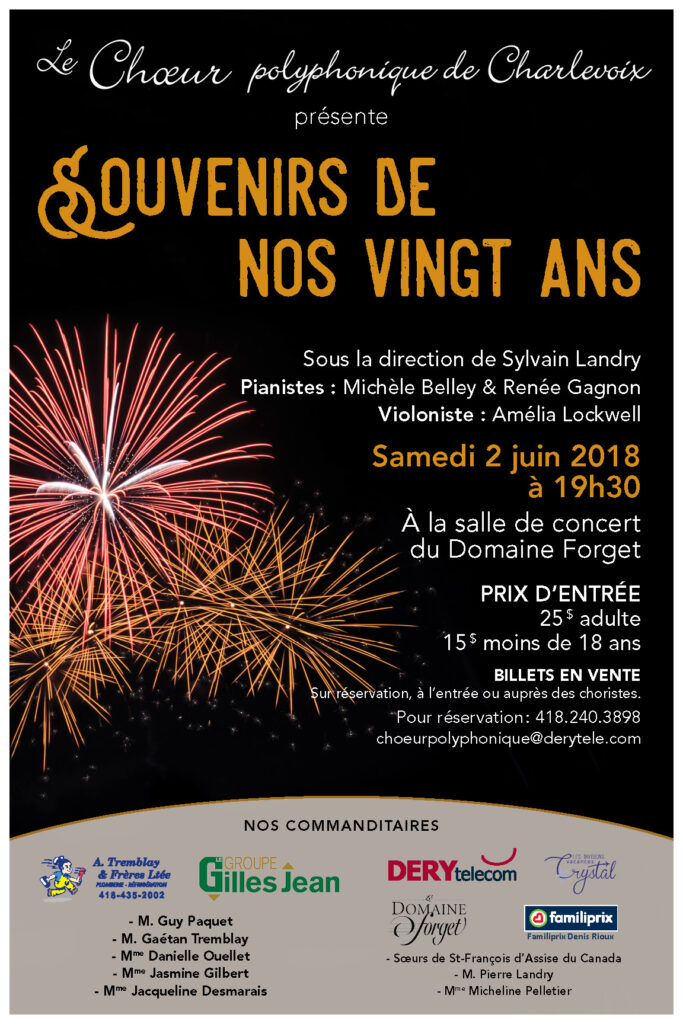 Le Chœur polyphonique prépare déjà le concert du printemps 2026, qui aura lieu à la Salle de concert du Domaine Forget le samedi 31 mai 2026. D’autres détails suivront prochainement concernant ce concert.
